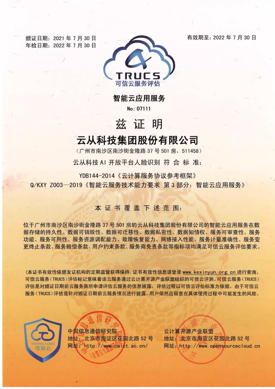 近日,我国云计算领域权威机构——可信云组织公布2021年度上半年可信云评估结果。云从科技AI开放平台凭借优质可靠的云服务技术,人脸识别、语音识别、文字识别三项智能云应用服务通过可信云评估服务。这标志着云从科技在提供更可信、安全的AI服务领域,获得的重要权威认可。