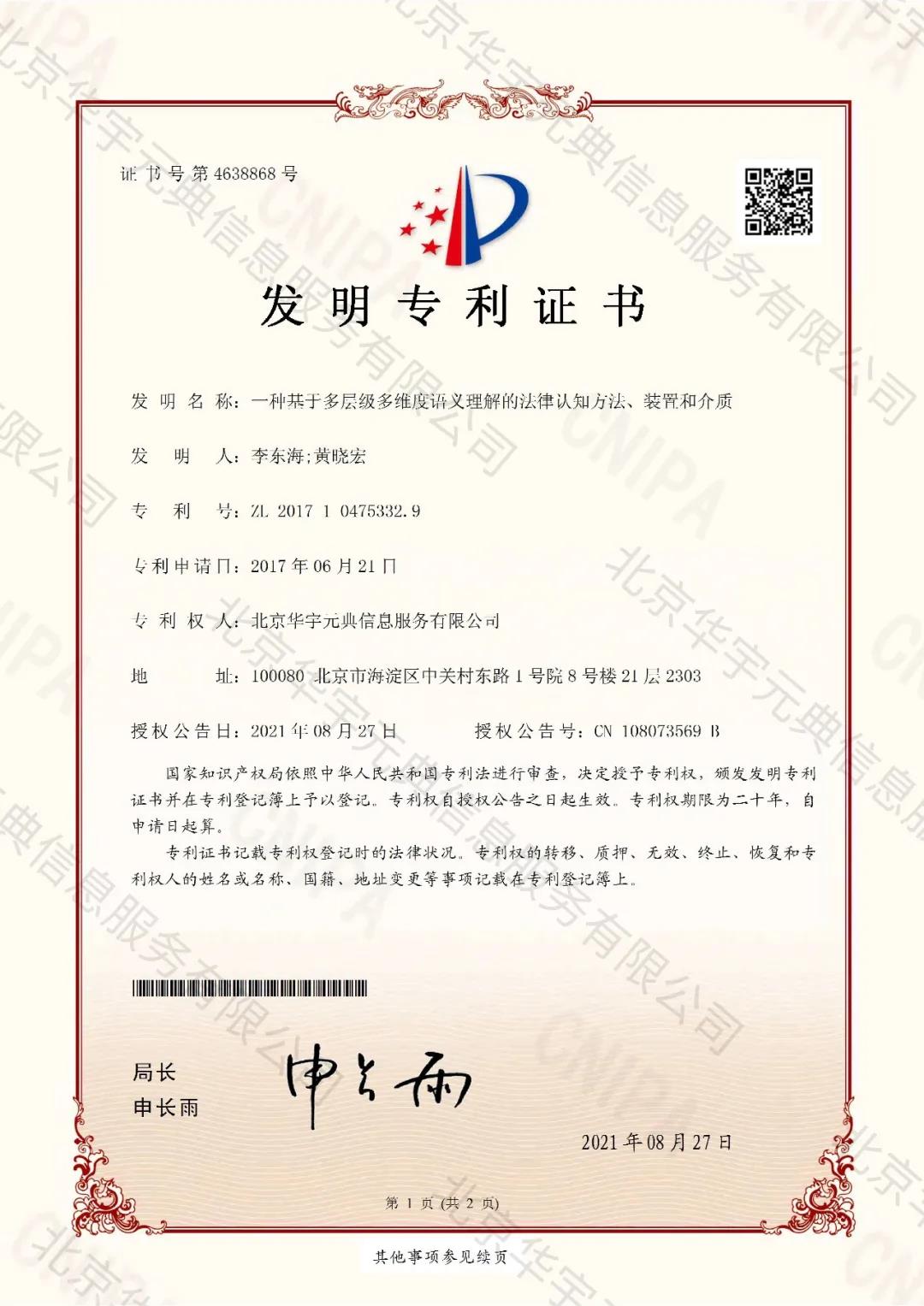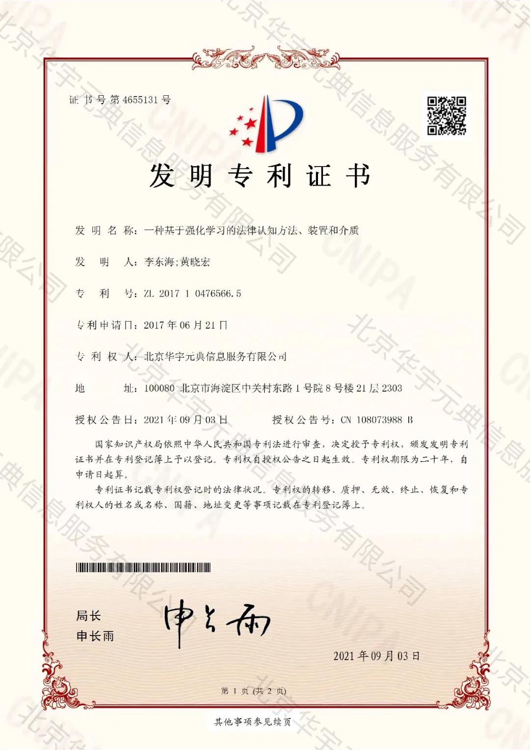 华宇元典的发明专利结合自主构建的法律知识图谱,通过基于多层级多维度语义理解的法律认知方法和基于强化学习的法律认知方法的设计,提高了计算机对法律知识的智能认知能力,从而进一步提高了机器处理法律业务问题的智能化水平。
