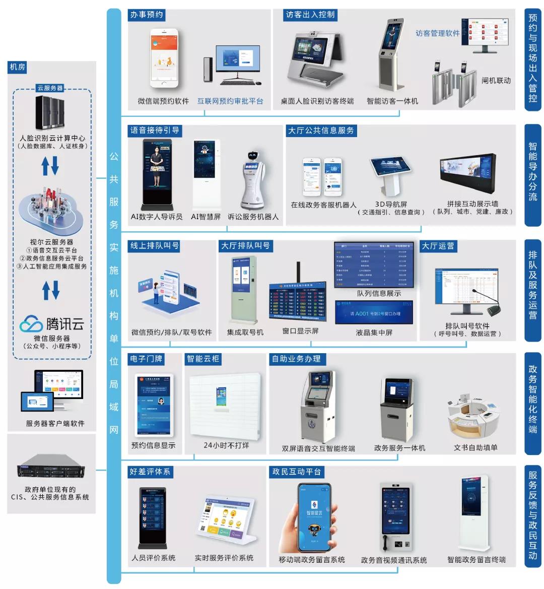 视尔信息遵照国家“互联网+政务服务”技术体系建设指南,运用泛政府领域重大项目建设成熟经验,结合智能语音、智慧屏等人工智能产品线,打造出AI+互联网+政务服务解决方案,通过实体政务服务大厅、VR虚拟服务大厅、移动端、自助终端等多种形式,致力为企业和群众打造“一站式、不见面”的智慧政务服务模式,实现办事事项智能预约、办事问题智能问答、办事材料智能生成、办事效能留言反馈等人工智能功能,保证政府管理与服务的持续优化与创新,为群众提供有序便捷、智能高效、线上线下协同的政务服务。