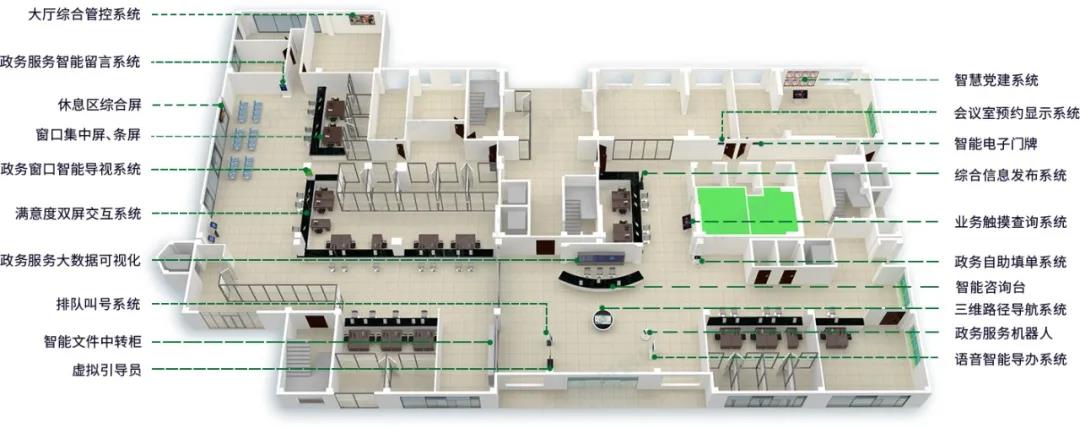 · 为群众和企业用户提供人脸识别、区域导航、查询、预约、排队取号、问答互动等智能服务;