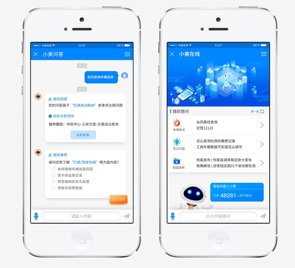 根据使用场景的不同,视尔提供在线问答机器人和智能咨询服务终端(含实体政务服务机器人),有效缓解政务大厅大量的咨询服务和业务办理进度查询压力,同时大大提升市民对政务服务的满意度。
