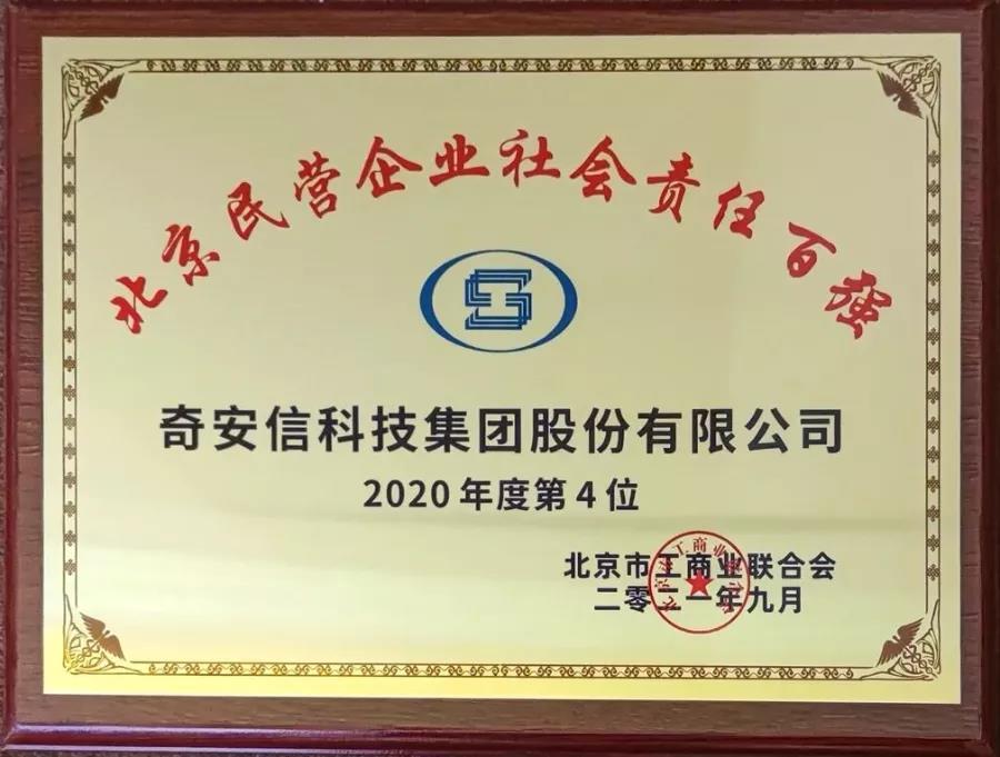 与此同时,凭借企业良好的社会责任担当,奇安信同时上榜“2021北京民营企业社会责任百强”,紧随美团、贝壳、小米位居第四。