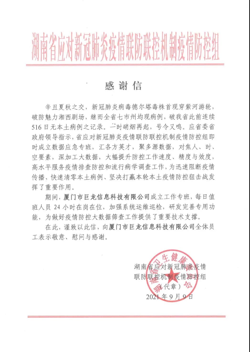近日,巨龙信息收到湖南省应对新冠疫情联防联控组发来的感谢信。今年7月底,湖南疫情再次来袭,巨龙信息应湖南省防控组要求快速成立工作专班,在疫情防控大数据筛查工作中提供技术支撑,为迅速阻断疫情传播,快速清零本地病例发挥了重要作用,防控组对工作专班团队在抗疫期间工作表示慰问与感谢!