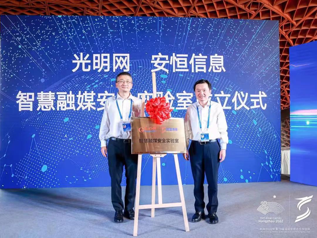 光明网总裁、总编辑杨谷和安恒信息董事长范渊共同揭牌