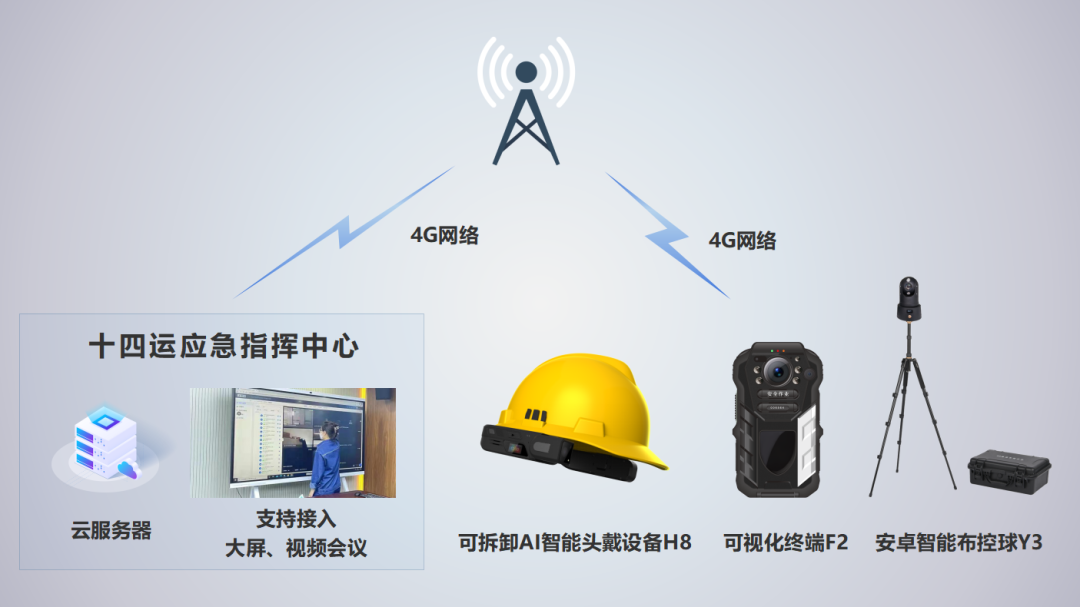 十四运保电现场应急数字化服务系统主要由可拆卸AI智能头戴设备(智能安全帽)、可视化终端、移动安卓布控球等智能终端及保电现场应急管理平台组成。