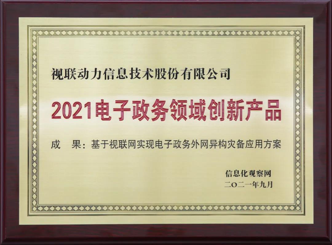 在9月24日举办的电子政务安全大会上,视联动力再获双料荣誉。视联动力信息技术股份有限公司荣获“2021电子政务领域影响力企业”称号。视联动力公司“电子政务异构灾备网”相关产品和解决方案凭借自主创新理念和突出贡献,获得“2021 电子政务领域创新产品”荣誉。