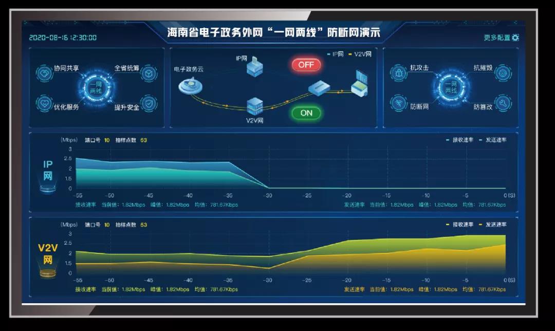 “一网”即统一的电子政务外网整体架构。“两线”指电子政务外网由互为备份的两条异构通道组成,包括原有IP通道,和基于视联网技术构建的异构灾备通道。“一网两线”双通道互为备份,整体安全加固,可实现链路状态自动感知,业务数据无感知自动保护切换。