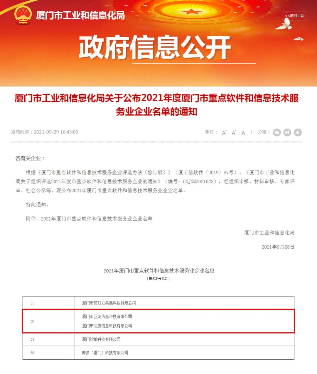 近日,厦门市工业和信息化局公布了2021年度厦门市重点软件和信息技术服务企业,经组织申报、材料审核、专家评审等环节,认定巨龙信息和全资子公司法度信息等98家为市级重点软件企业。