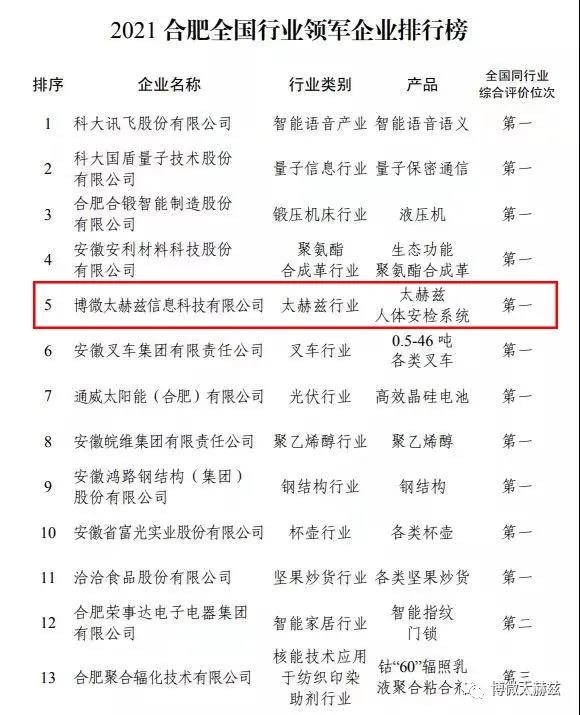 10月19日,2021合肥企业50强发布会在市政务中心举行。市长罗云峰出席会议并讲话,副市长赵明主持会议。市政府秘书长罗平参加。会上发布了以合肥企业50强为代表的一批骨干企业,其中博微太赫兹进入2021合肥全国行业领军企业排行榜,榜单公布,博微太赫兹在太赫兹行业,是全国同行业综合评价中排名第一的企业!