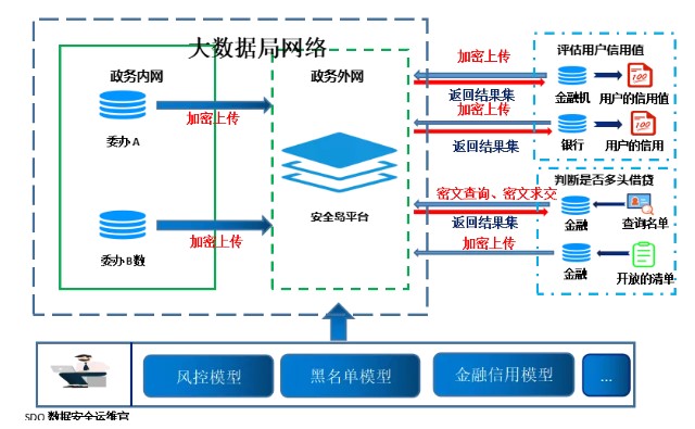 大数据局掌握基本信息,包括家庭住址、公积金、住房等信息,银行和金融机构掌握用户银行卡借贷情况。大数据局将所持有的用户个人信息数据加密共享,金融机构和银行将本机构用户银行借贷情况进行加密,加密后的政务数据上传至AiLand进入可信执行环境(BDTee),经过融合计算获取计算后的用户信用值,来确认贷款用户是否存在“多头借贷”的情况。