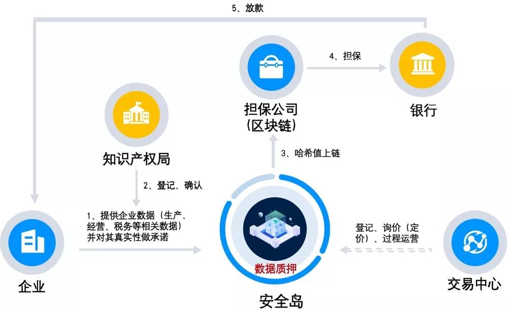 企业提供加密数据、知识产权局登记确认数据价值、AiLand将加密后的数据哈希值计算、担保公司得到计算后的数据集上传至区块链担保,银行确认企业和担保信息放款,大数据交易中心登记、询价并对过程运营,同时可以获得相应商业价值。