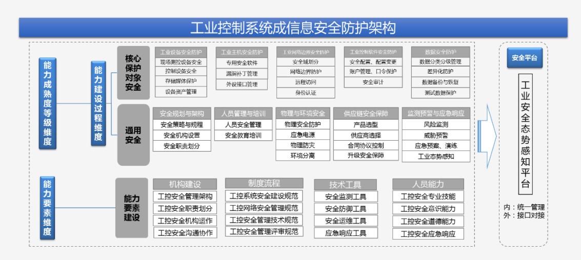根据《工业控制系统信息安全防护指南》和《信息安全技术工业控制系统信息安全防护能力成熟度模型(报批稿)》等政策标准中的防护要点,安恒信息形成了以能力要素建设为基础,通用安全为保障,核心保护对象安全为核心,工业安全态势感知平台为抓手的安全防护架构。本项目中,安恒信息按照《成熟度模型》三级要求协助大冶特殊钢有限公司进行安全建设,并提出将工业控制系统信息安全防护能力建设提升到成熟度4级(综合协同),并向5级(智能优化)目标迈进的规划建议。