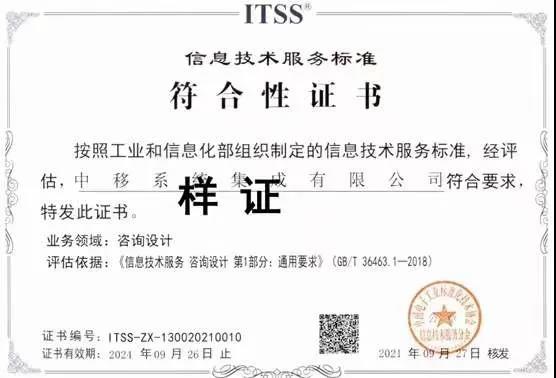 2021年9月27日,中移系统集成有限公司通过工业和信息化部组织制定的信息技术服务标准认证,成功获批“信息技术服务标准符合性证书”,这是中国移动在IT技术服务领域获得的首个国家级咨询设计资质,标志着中国移动在数字化咨询领域,正式进入国家队行列。