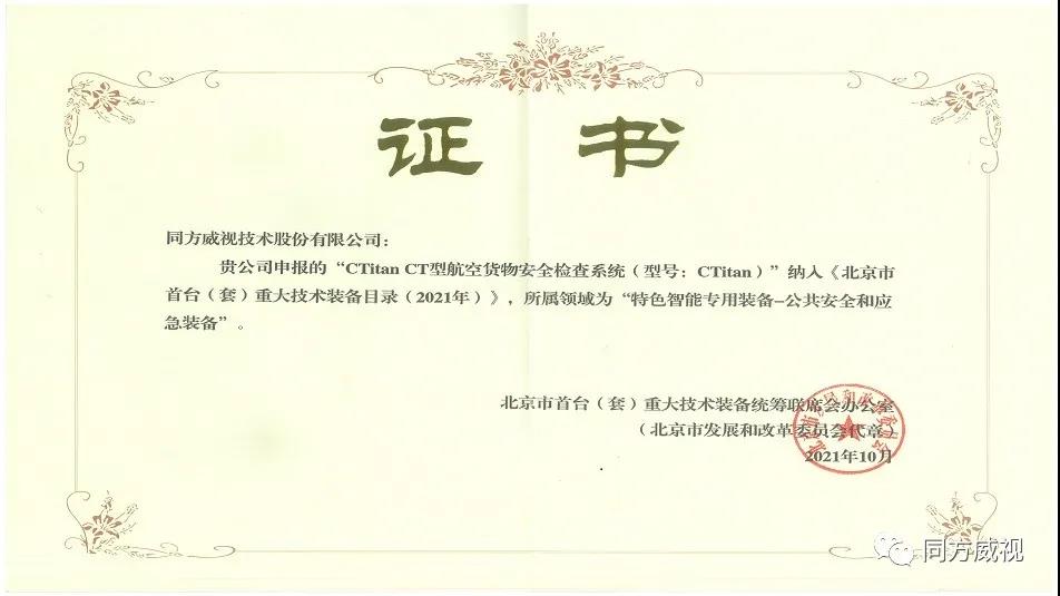 10月22日,由北京市首台(套)重大技术装备统筹联席会办公室、北京市发展改革委牵头组织的“2021年首台(套)重大技术装备授牌暨项目路演活动”在中关村国家自主创新示范区展示中心成功举办,活动对实现重大技术突破的企业及产品集中授牌。同方威视CTitan CT型航空货物安全检查系统被纳入《北京市首台(套)重大技术装备目录(2021年)》。