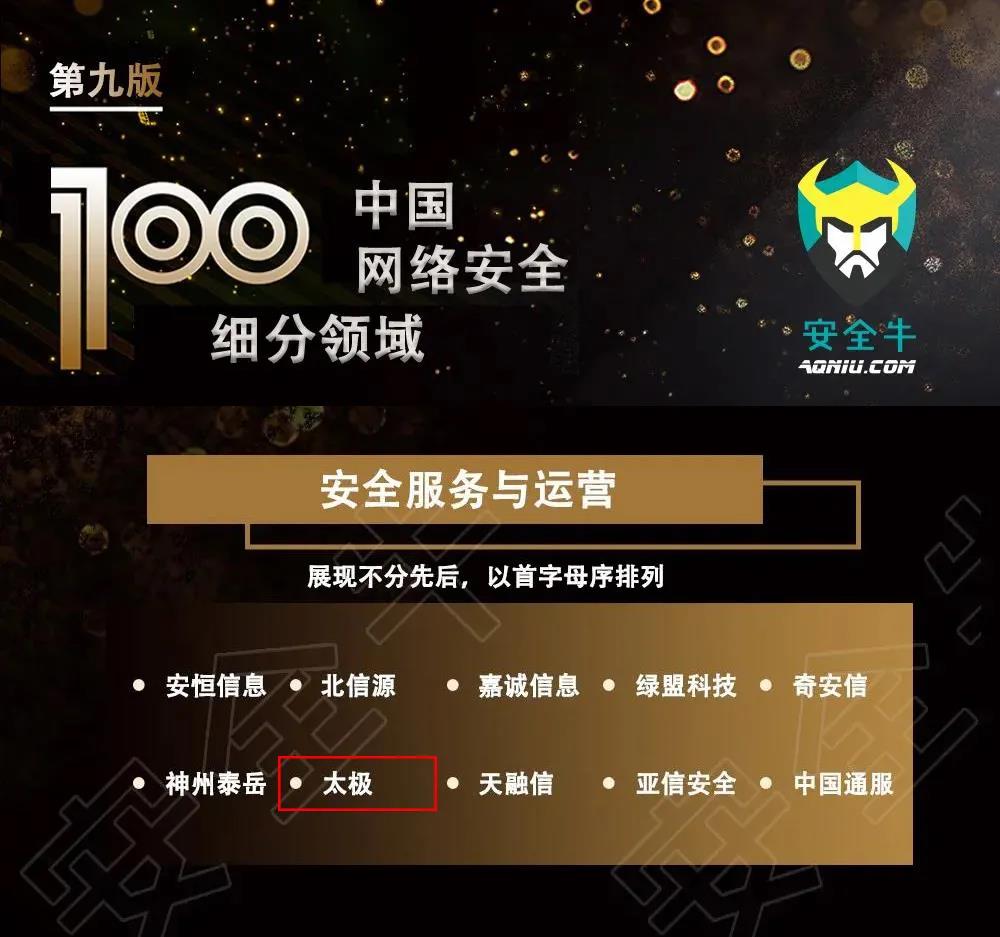 11月9日,国内权威安全媒体“安全牛”发布了《中国网络安全企业100强》(第九版)。太极股份凭借在数据安全领域的卓越表现入选2020年“中国网络安全企业100强”,并被评选为安全服务与运营细分领域的代表企业。