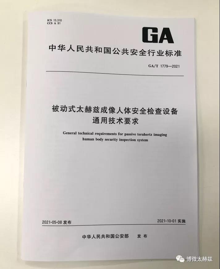 随着《被动式太赫兹成像人体安全检查设备通用技术要求》(GA/T 1779-2021)的正式发行,一切正在改变。该标准由全国安全防范报警系统标准化技术委员会(SAC/TC100)组织制定、由博微太赫兹信息科技有限公司主导起草与申报,标准于2021年5月28日发布,2021年10月1日实施,现已正式印刷。