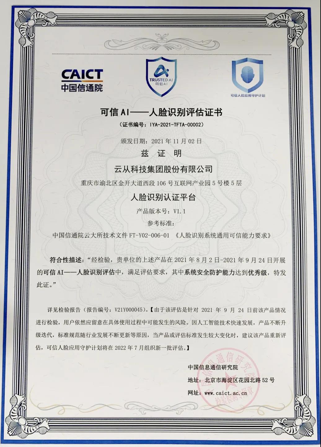 这体现出云从的技术在安全性、可靠性等方面居于行业领先水平,切实保护用户信息安全,具备安全可靠、透明性、数据保护、明确责任、公平性等全面的可信能力,得到权威机构的认可。