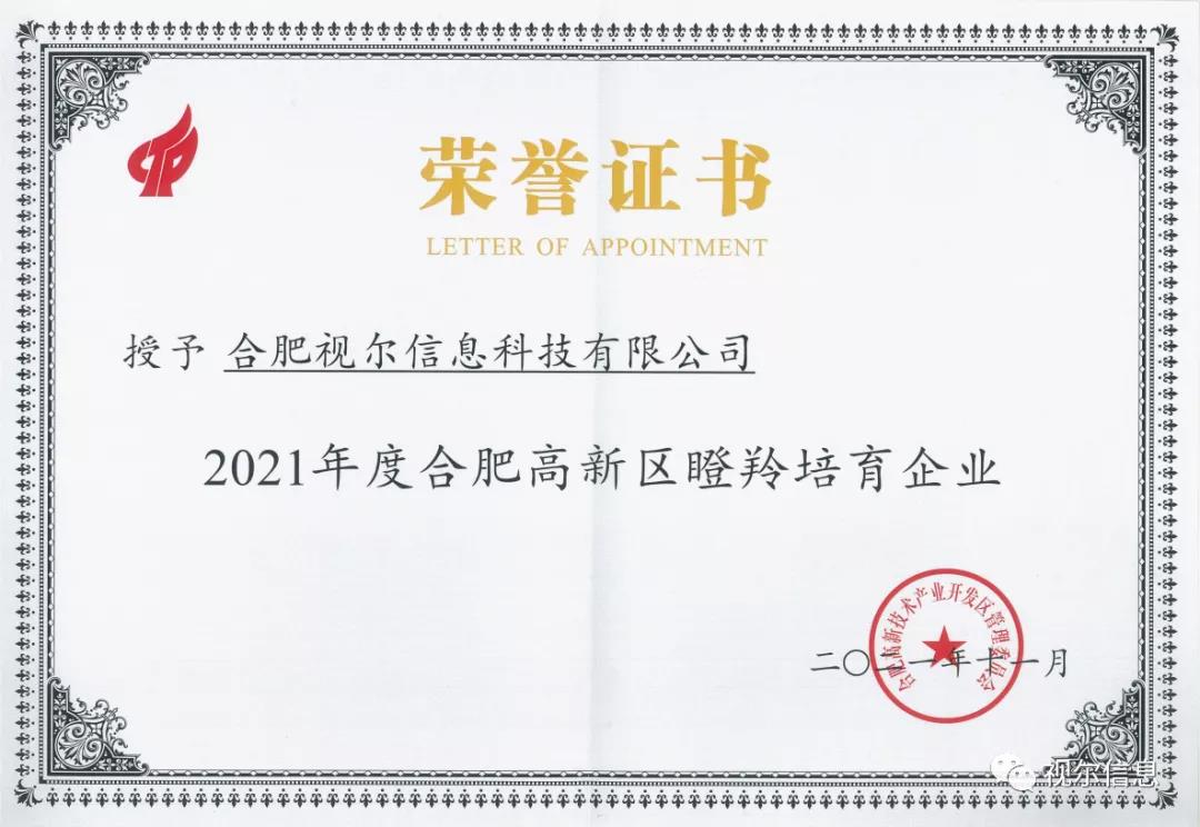 近日,合肥市高新区2021年度高成长企业榜单发布,视尔荣获合肥高新区“2021年度合肥高新区瞪羚培育企业”称号,标志着我司迈入创新发展的新阶段。