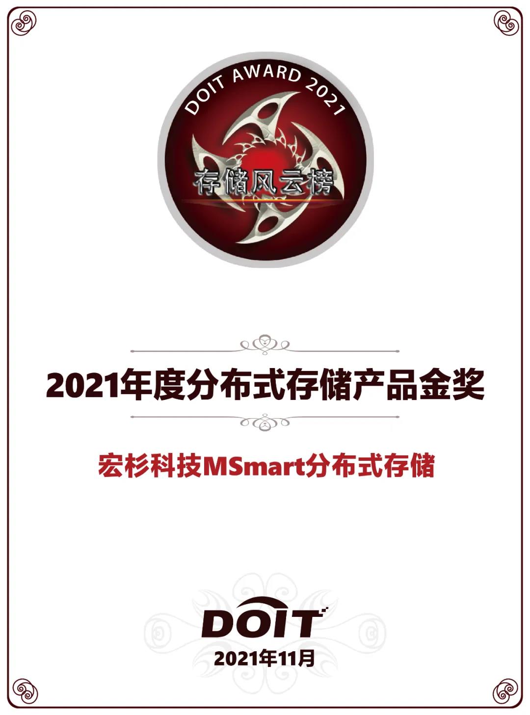 在11月23日的峰会主论坛上还揭晓了《2021存储风云榜》,该榜单旨在表彰在存储技术创新和产品应用方面做出突出贡献的企业,集中体现存储前沿技术与最佳应用、 树立行业标杆典范。宏杉MSmart分布式存储凭借海量的数据存储、智能的数据算法、高效的数据共享和灵活的管理方式等特色斩获“2021年度分布式存储产品金奖”荣誉称号。