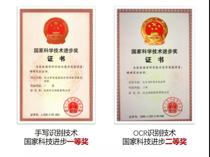 说到这里,就不得不提一下汉王影研的OCR识别能力,它支持印刷体识别、手写体识别、印刷手写混合识别、证件识别、表格识别、印章识别等,目前印刷材料的识别准确率达到99%,手写体文字识别准确率达95%以上,高于人眼辨认,在行业内处于领先地位。更值得一提的是,汉王的手写识别技术曾获国家科技进步一等奖,OCR识别技术曾获国家科技进步二等奖。