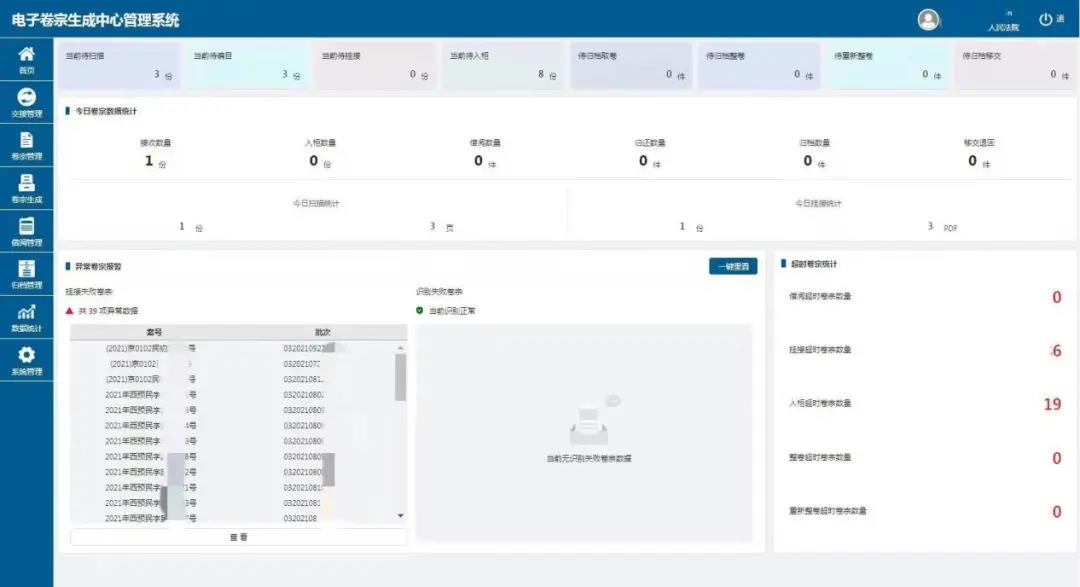 提供对电子卷宗数据的标准验证服务,为用户提供电子卷宗生成质量检测、生成时效检测、纸质卷宗存储空间预警、可视化数据质量报告等能力。