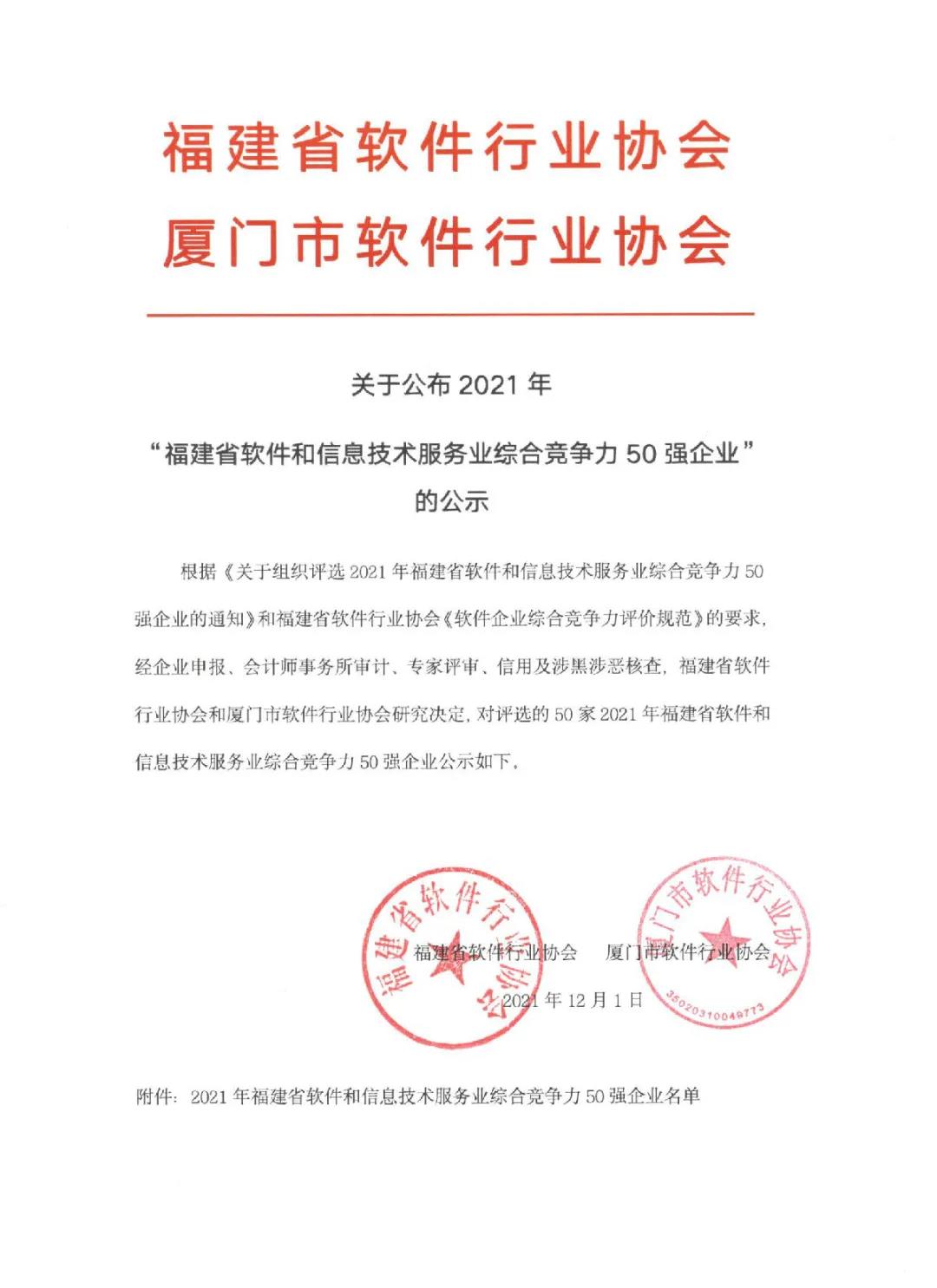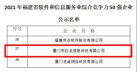 日前,由福建省软件行业协会和厦门市软件行业协会组织开展的“福建省软件和信息技术服务业综合竞争力50强企业”名单公示,巨龙信息成功入选。