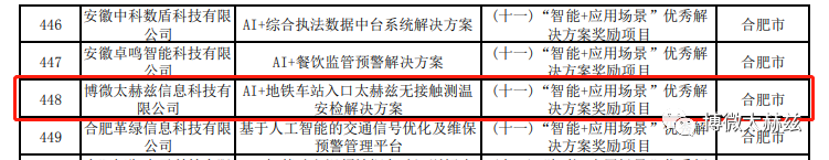 2021年12月7日,安徽省经济和信息化厅对2021年制造强省建设、中国声谷、中小企业(民营经济)和工业互联网发展政策资金拟支持项目进行了公示,博微太赫兹公司“AI+地铁车站入口太赫兹无接触测温安检解决方案”成功入选2021年中国声谷“智能+应用场景”优秀解决方案名单。