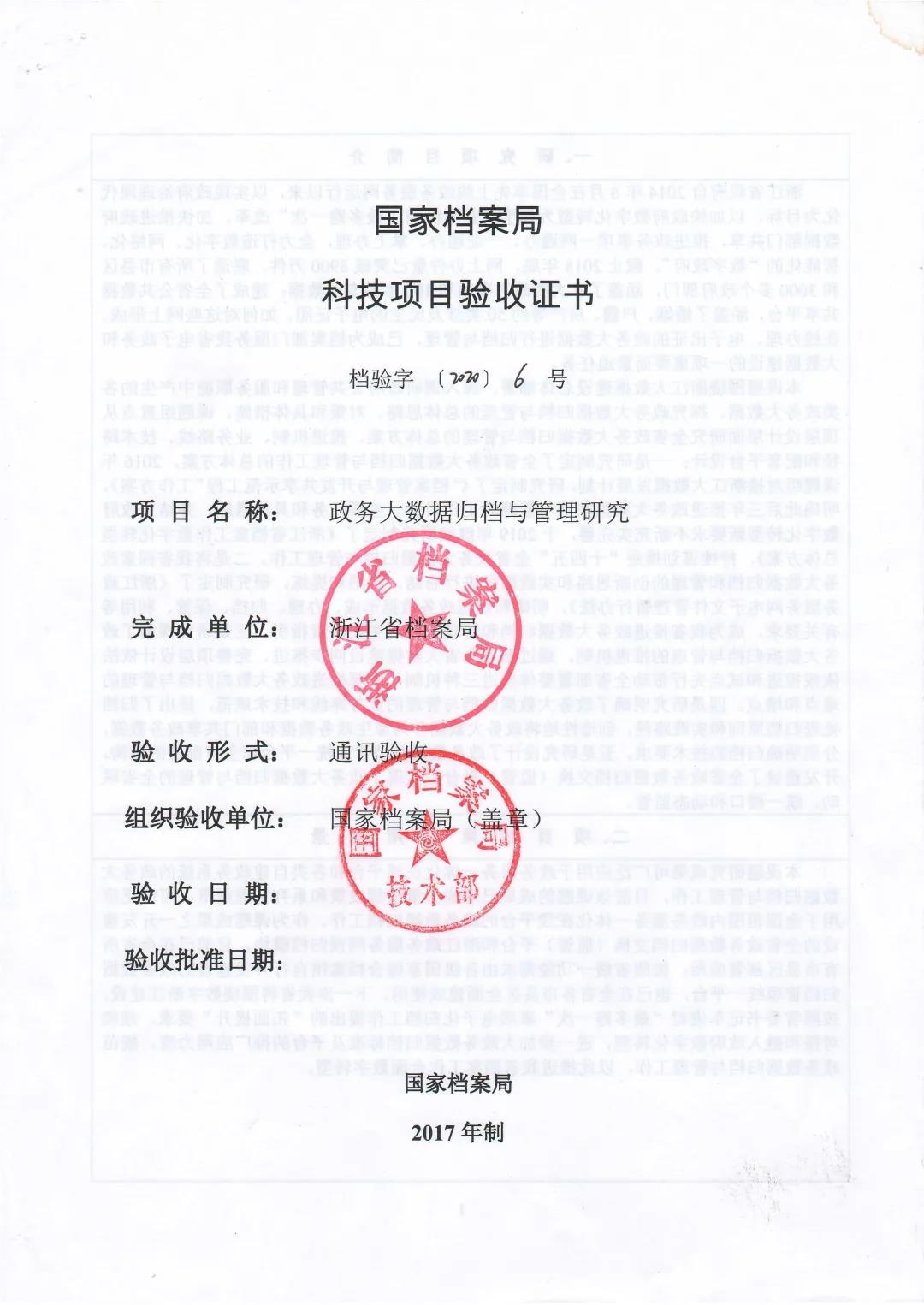 2016年,南威软件集团参与浙江省档案局《政务大数据归档与管理研究》课题,该课题列入国家档案局2016年度科技项目计划,于2020年3月份顺利通过国家档案局验收,并于2021年7月获得国家档案局优秀科技成果二等奖(公示期)。