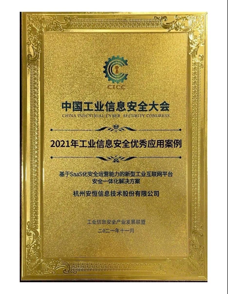 在本年度案例征集展示活动中,安恒信息“基于SaaS化安全运营能力的新型工业互联网平台安全一体化解决方案”荣获“2021年工业信息安全优秀应用案例”。这是自2018年工业信息安全产业发展联盟首次举办案例征集活动以来,安恒信息连续第四年入选优秀应用案例。四次入选案例分别为: