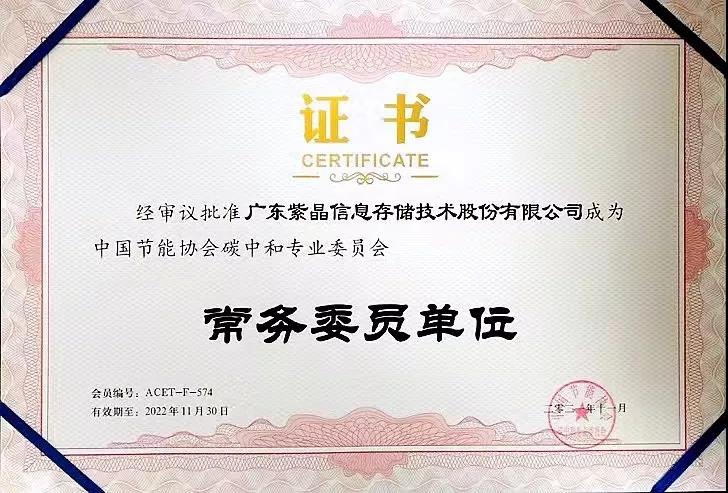 紫晶存储正式成为“中国节能协会碳中和委员会常务委员单位”