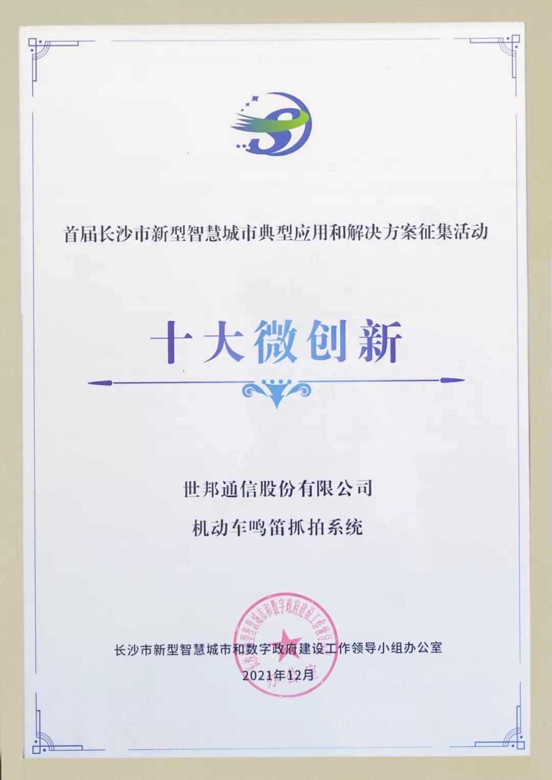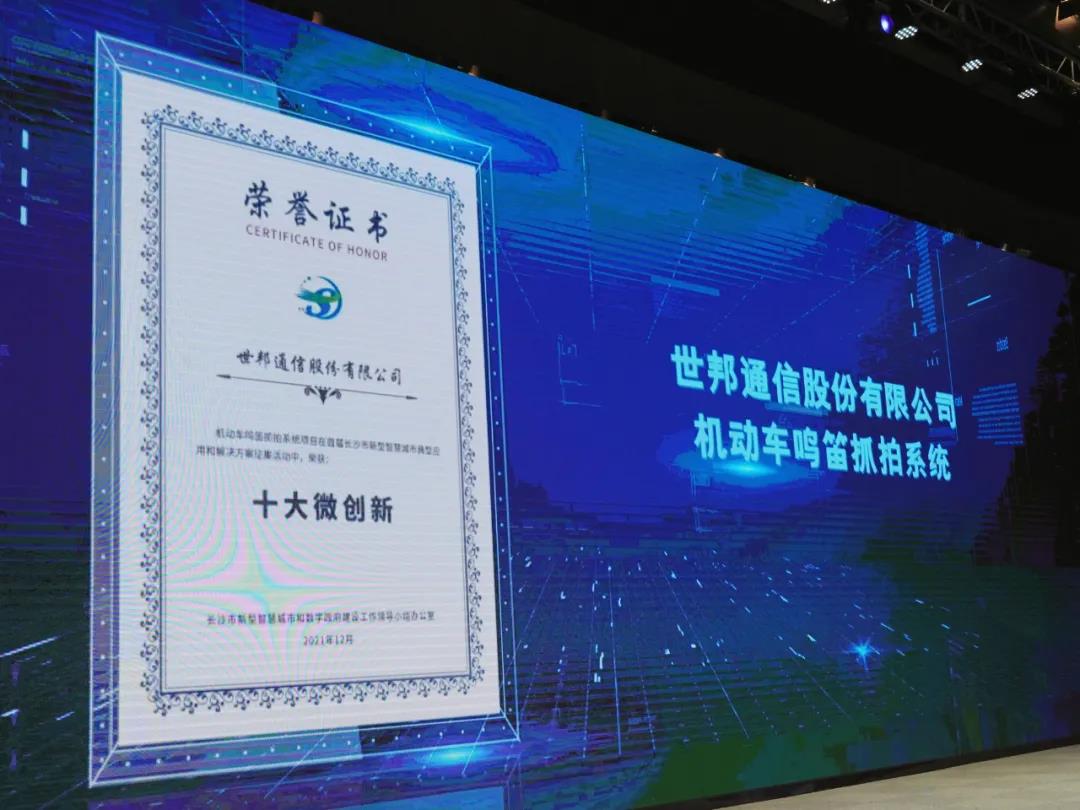 为深入贯彻习近平总书记考察湖南重要讲话精神,落实中国共产党长沙市第十四次代表大会工作部署,加快数字经济发展,推动长沙市数字经济建设,共建新型智慧城市产业生态,2021年12月10日,“共享智慧成果共建数字生态”首届长沙市新型智慧城市典型应用和优秀解决方案发布会暨数字生态共建大会召开。会上宣布长沙市新型智慧城市典型应用和优秀解决方案最终入选案例,世邦通信机动车鸣笛抓拍系统解决方案被评为“长沙市新型智慧城市十大微创新方案”。