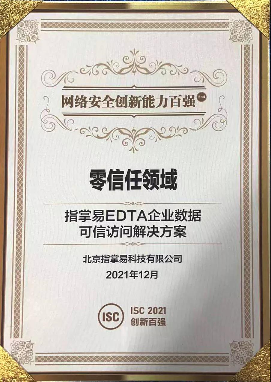 12月14日,ISC 2021网络安全创新能力百强(简称“创新百强”)正式发布,本次创新百强评选精准覆盖年度创新安全领域,以创新力为唯一标准,遴选出十大热点领域的创新百强企业。指掌易凭借在零信任安全领域突出的技术实力和优秀的市场表现,斩获“零信任领域”创新奖。