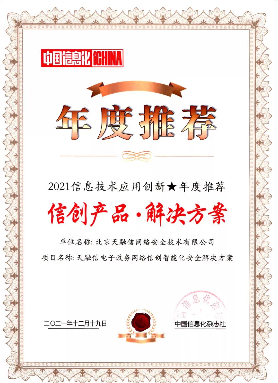 近日,《中国信息化》杂志社公布“2021信息技术应用创新年度推荐”入选名单,本次年度推荐活动聚焦新一代信息技术应用创新案例、产品和解决方案在行业领域中的应用和实效,旨在进一步促进供需协同创新发展、把握信息技术应用创新最新进展、持续向社会推广创新成果。《天融信电子政务网络信创智能化安全解决方案》成功入选,充分彰显天融信在信创安全领域的创新能力和领先实力!