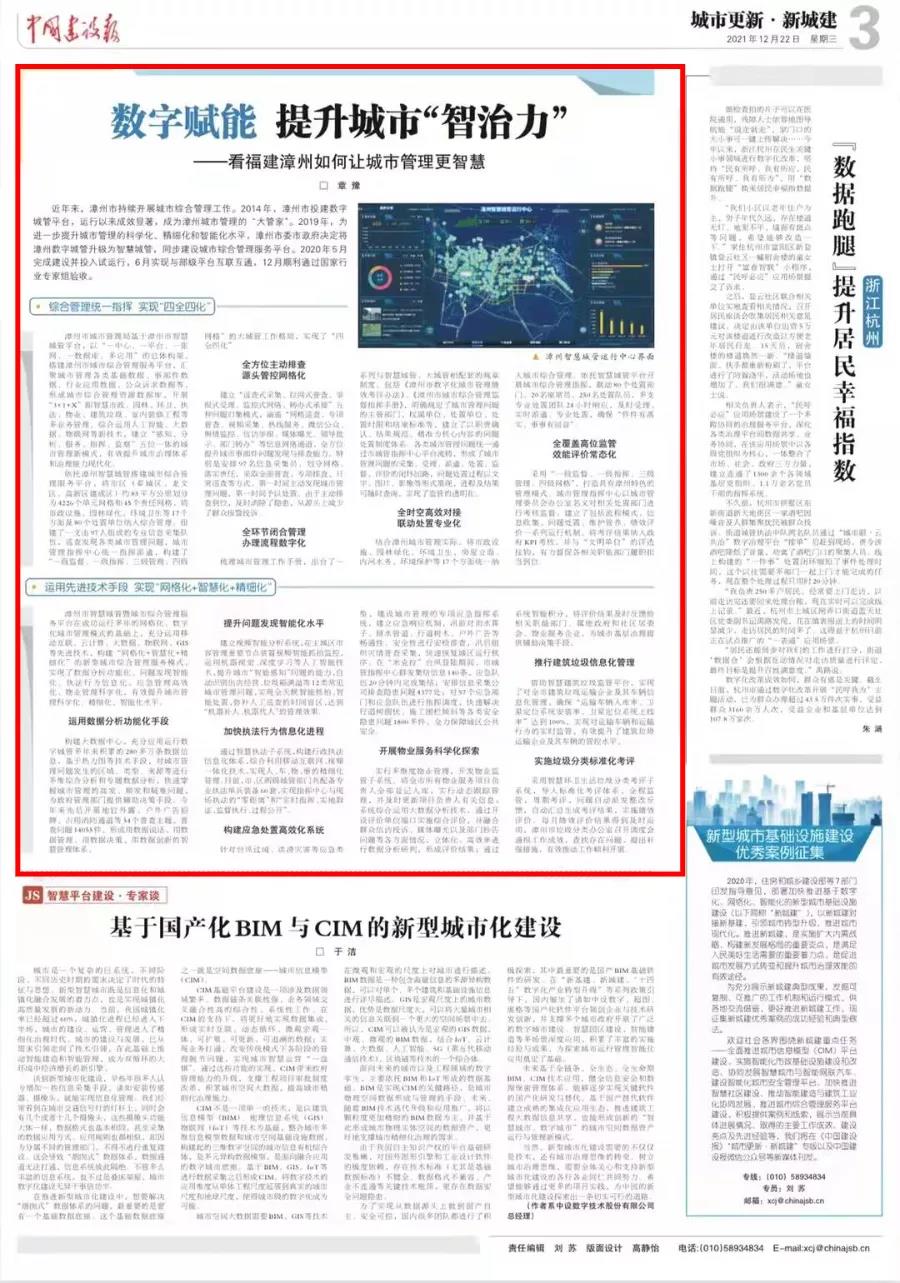 12月22日,《中国建设报》第三版刊发专题文章《数字赋能 提升城市“智治力”——看福建漳州如何让城市管理更智慧》。