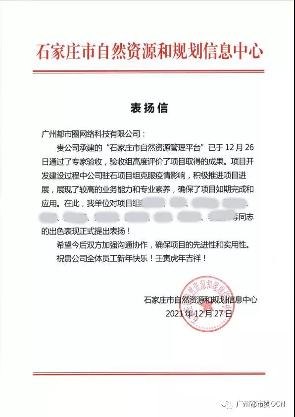 近日,都市圈收到了来自石家庄市自然资源和规划信息中心发来的表扬信,信里对“石家庄市自然资源管理平台”项目建设过程中,都市圈团队的业务能力、专业素养和出色表现正式提出表扬!