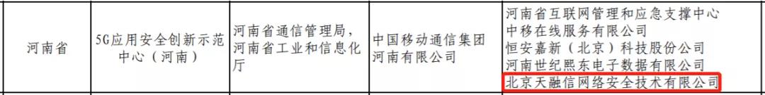 近日,工业和信息化部公布首批5G应用安全创新示范中心遴选认定结果,天融信与河南移动等单位联合申报的5G应用安全创新示范中心(河南)成功入选,标志着天融信5G安全创新能力、应用示范能力获权威认可。