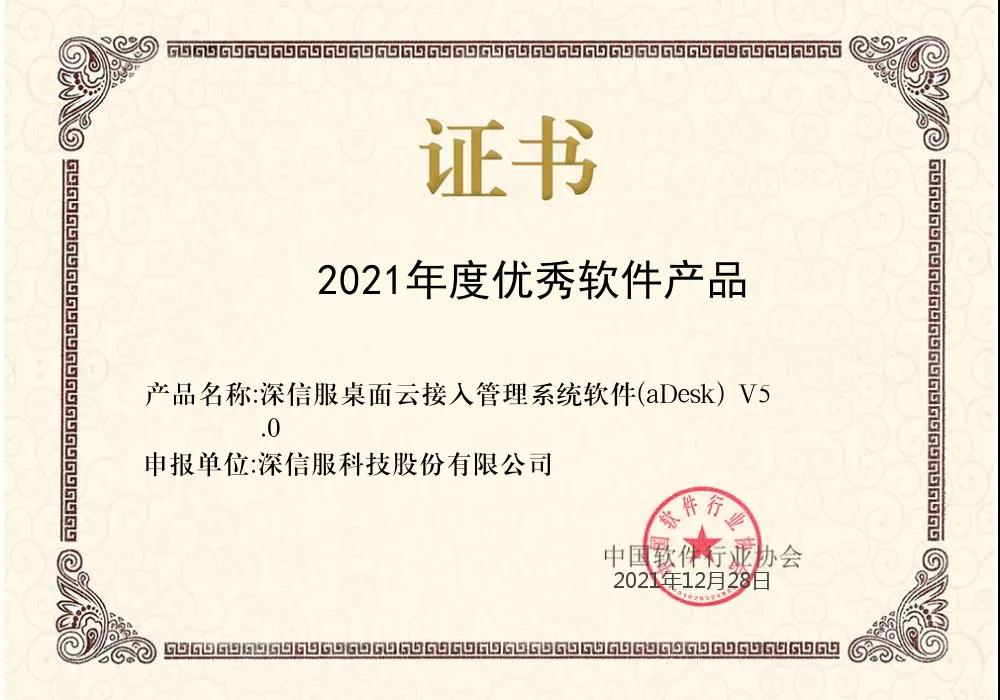 近日,中国软件行业协会公布了2021年年度推广优秀产品名单,深信服桌面云接入管理系统软件(aDesk)经过严格评审,获评“2021年度优秀软件产品”。