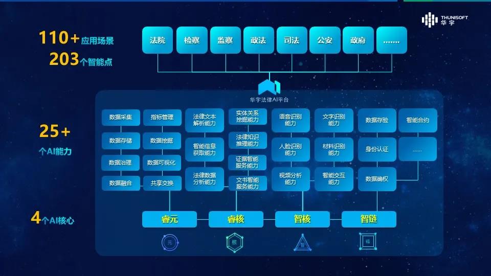 华宇自成立以来,一直在法律科技领域深耕,尤其近年来,随着人工智能等新技术的不断涌现,华宇深度打磨出法律人工智能平台。迄今为止,平台已发布V3.0版,包含25+个AI能力,触达110+应用场景、203个智能点,应用于全国法院、检察院、司法行政、政法委、纪委监察委、公安等多个行业的业务场景,覆盖千余家客户单位。