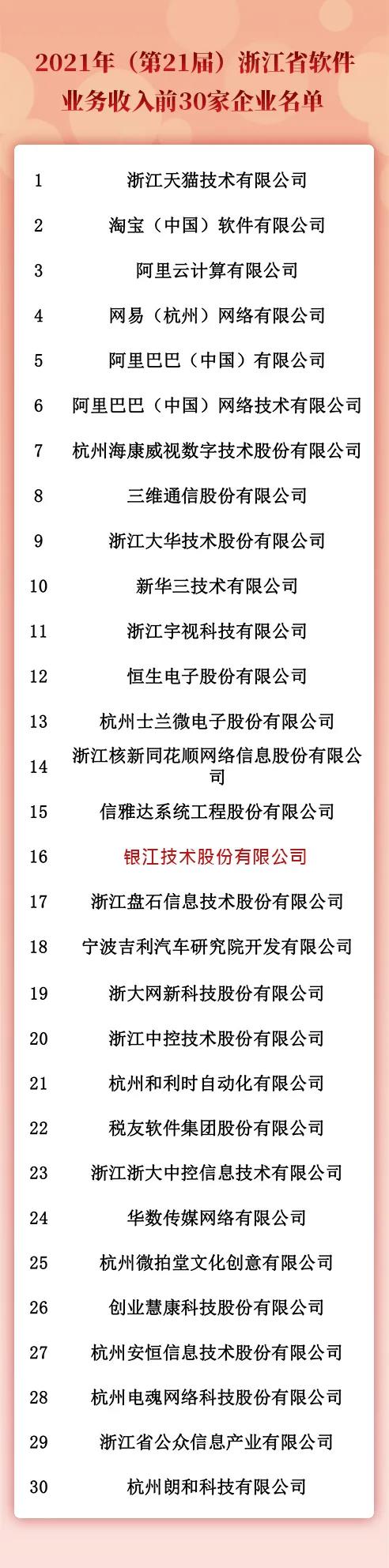 近日,省经信厅公布了2021年浙江省电子信息产业百家重点企业名单,银江技术股份有限公司成功入选2021年浙江省软件业30家重点企业,排名16位,公司出色的软件研发能力和科技竞争力得到业界充分认可。