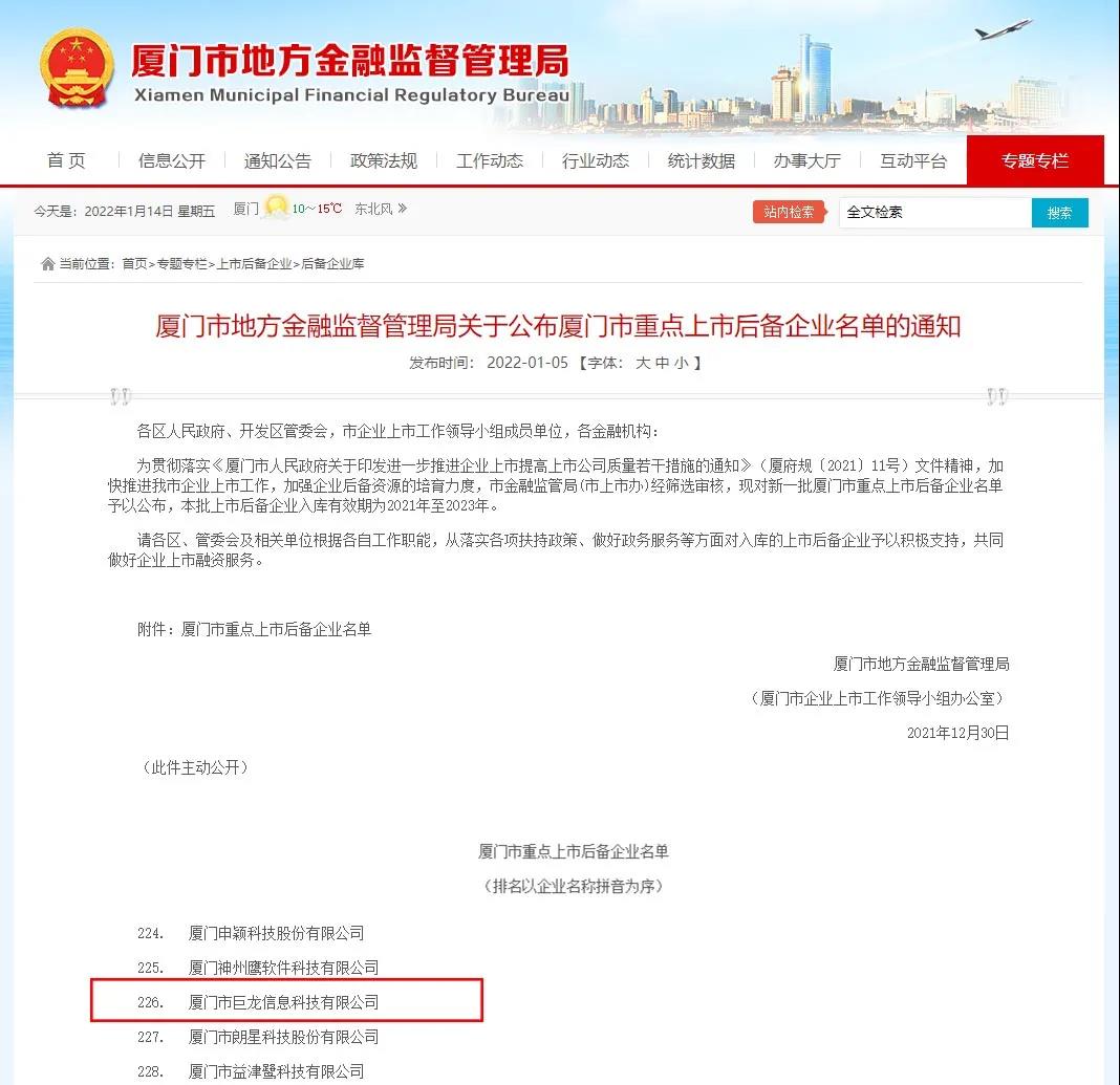 近日,为加快推进厦门市企业上市工作,加强企业后备资源的培育力度,经过厦门市金融监管局筛选审核,新一批“厦门市重点上市后备企业名单”公布,巨龙信息等254家企业入库,本批上市后备企业入库有效期为2021年至2023年。