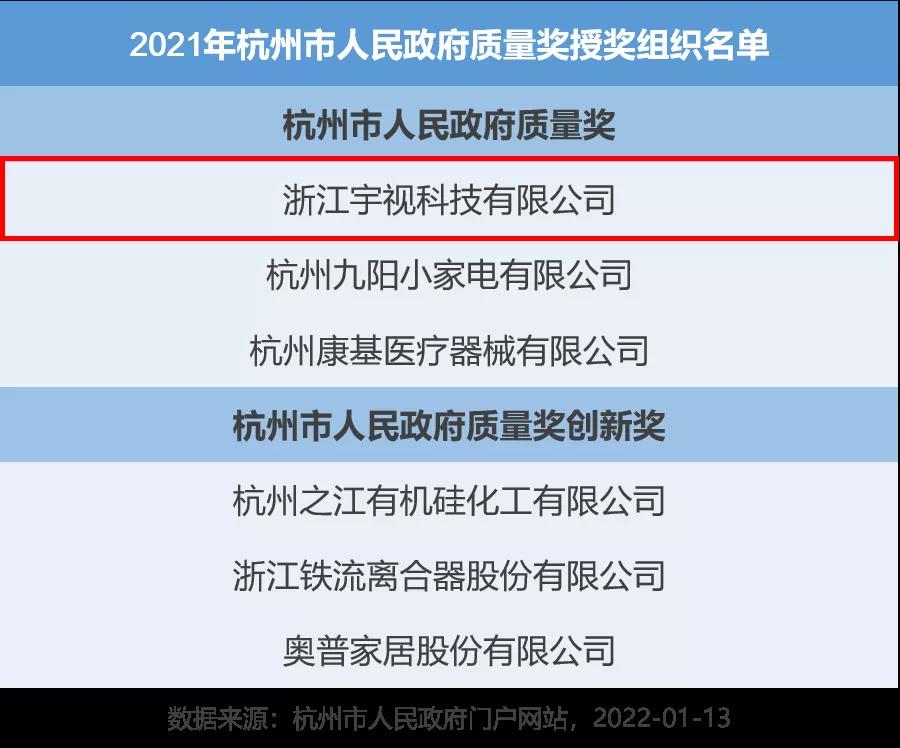 2022年1月13日,杭州市人民政府办公厅公布质量奖评审结果:宇视科技(uniview)凭借卓越绩效管理模式和突出效益成果,荣获杭州市人民政府质量奖——这也是市政府设立的最高质量奖项。
