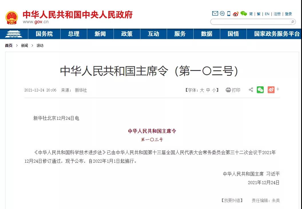 2021年12月24日,中华人民共和国主席根据全国人民代表大会及其常务委员会的决定签发《中华人民共和国主席令(第一〇三号)》,中华人民共和国第十三届全国人民代表大会常务委员会第三十二次会议修订通过了《中华人民共和国科学技术进步法》(后称《科学技术进步法》),并于2022年1月1日起施行。