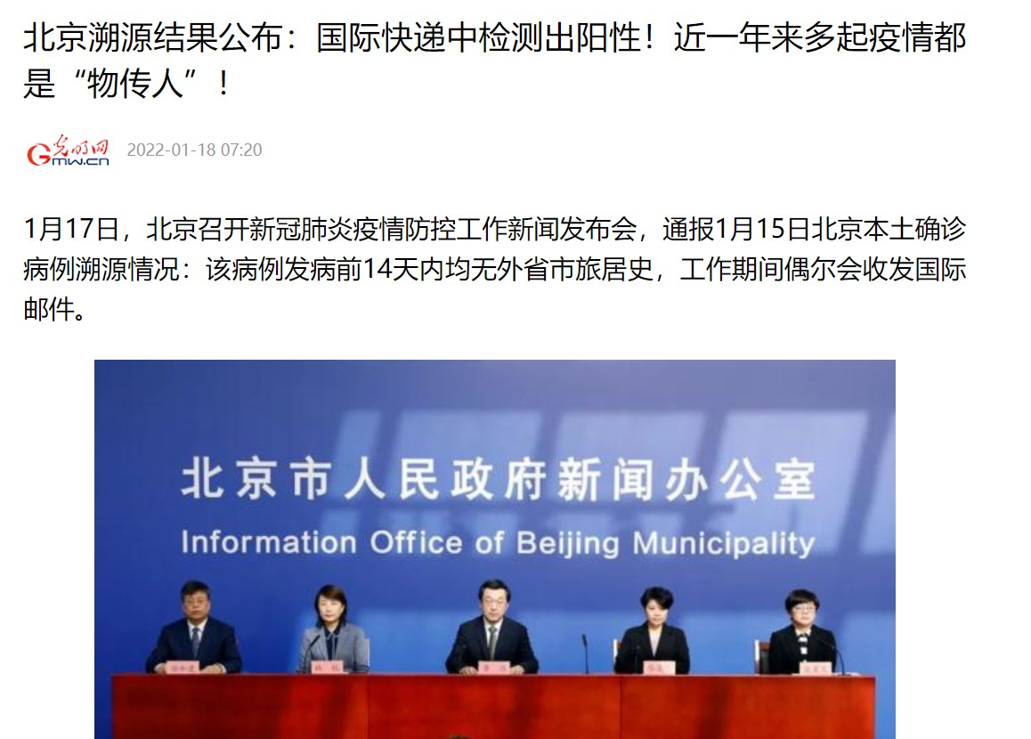 自天津爆发奥密克戎疫情以来,全国多地爆发疫情。1月15日,北京市海淀区接第三方检测机构报告一例新型冠状病毒肺炎核酸检测初筛阳性,根据北京召开新闻发布会通报该病例发病前14天内均无外省市旅居史,工作期间偶尔会收发国际邮件,在国际快递中检测出阳性。