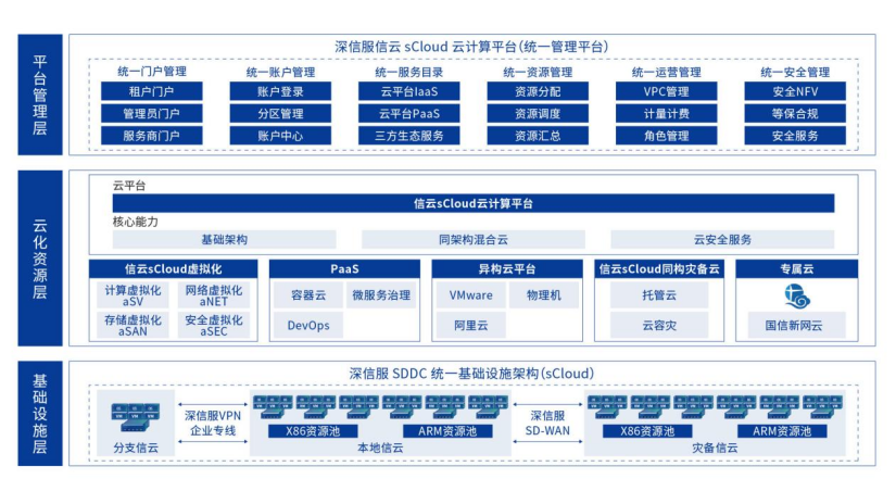 深信服信云sCloud 是面向下一代数据中心的、软件定义的IT基础架构。信云sCloud通过虚拟化技术融合计算、存储、网络和安 全等 IT 资源,具备租户管理、运维管理、智能监控、数据保护、容灾备份、云内安全防护等功能特性,为用户提供高稳定、极致性能、高安全、灵活起步、弹性扩容、极简运维等价值,并可以广泛兼容国内软、硬件生态。
