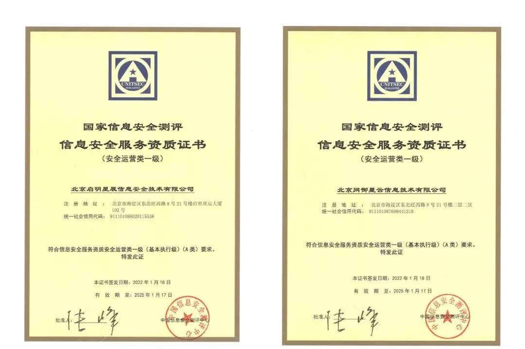 近日,启明星辰集团旗下北京启明星辰信息安全技术有限公司、北京网御星云信息技术有限公司同时获得国家信息安全服务资质安全运营类一级!