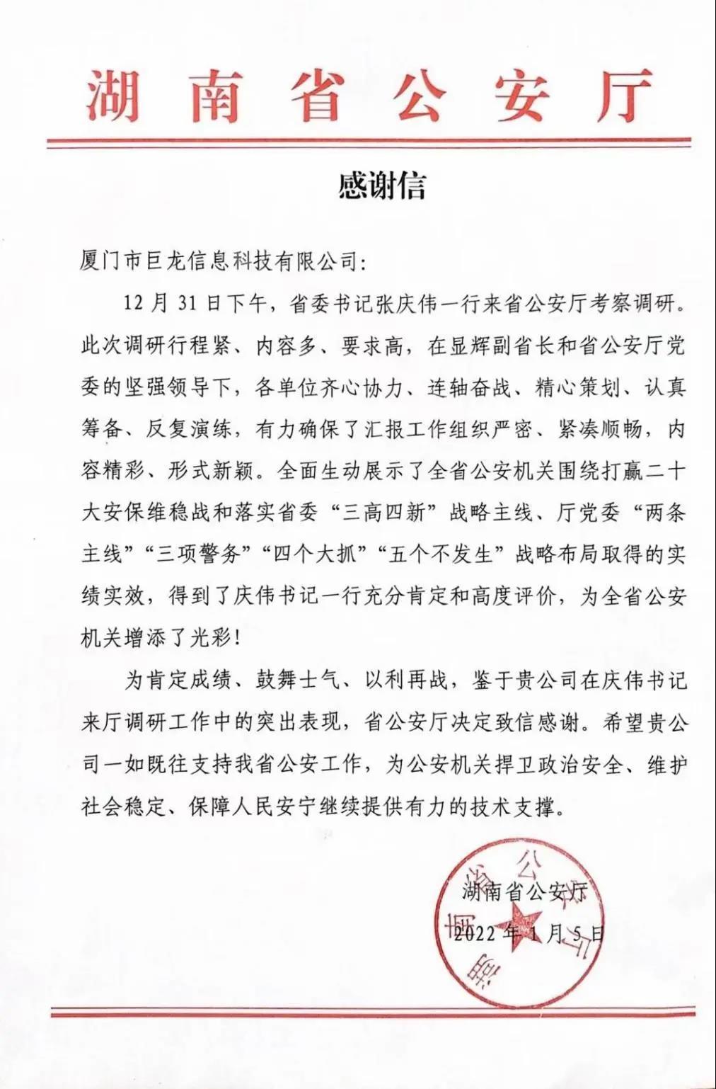 2022年春节即将到来,喜讯连连捷报传,硕果累累谱新篇。近日,巨龙信息收到一封来自湖南省公安厅的感谢信,高度赞扬了现场项目团队的敬业精神和突出表现。