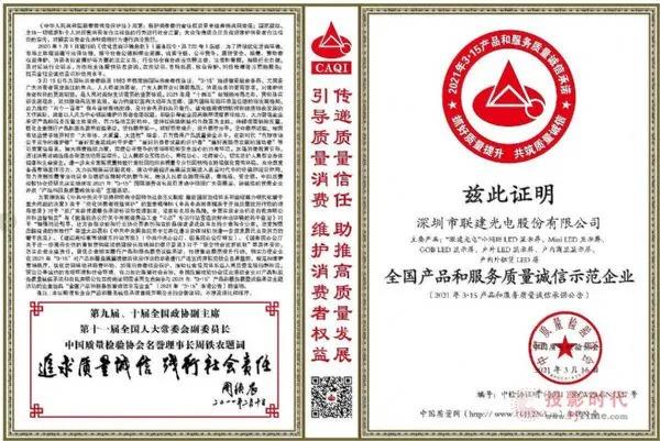 2021年3月,由中国质量检验协会主办的2021年全国“3.15质量月”活动中,联建光电凭借在产品制造与产品服务过程中的质量意识和诚信责任担当,荣获“全国产品和服务质量诚信示范企业”、“全国LED显示屏行业质量领军企业”、“全国产品和服务质量诚信领先品牌”3项殊荣。
