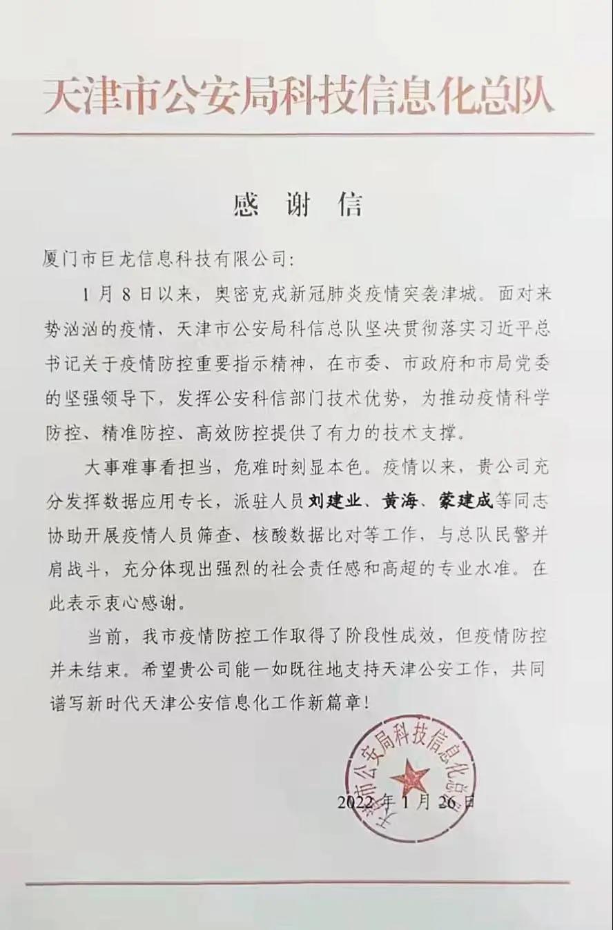 近日,巨龙信息收到天津市公安局科技信息化总队发来的感谢信。今年1月8日以来,奥密克戎新冠肺炎疫情突袭津城,收到天津公安协助指令,巨龙信息现场团队充分发挥数据应用专长,协助大数据筛查、核酸数据比对等工作,为推动疫情科学、精准、高效的防控提供有力的技术支撑,天津公安对现场团队在抗疫期间给予支持表示感谢!