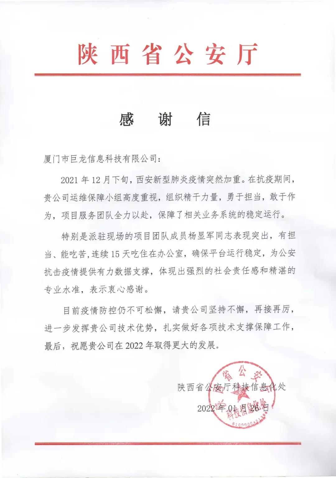 2021年12月,疫情肆虐古城西安,众志成城,全力抗疫。1月24日,西安全域降为低风险地区,此次抗疫取得突破性胜利!疫情防控期间,巨龙信息陕西现场团队坚持以客户为中心,组织精干力量,为抗疫提供有力数据支撑,陕西省公安厅科技信息化处为此发来感谢信表示肯定与鼓励,令我们对新的一年充满希望,充满信心!