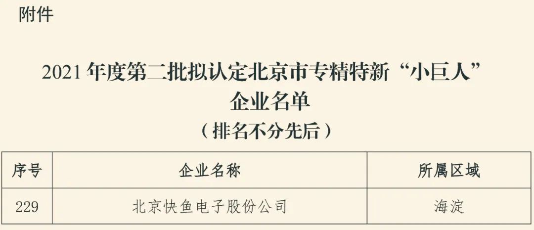 2022年2月10日,北京市经济和信息化局将2021年度第二批拟认定北京市专精特新“小巨人“企业名单予以公示,北京快鱼电子股份公司获评入选,被认定为“北京市专精特新‘小巨人’企业”。